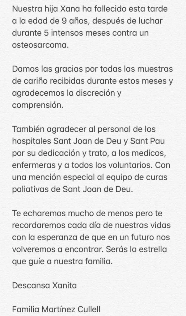 El Ex DT Español Luis Enrique Martínez a través de un comunicado en la noche de este jueves hizo público el fallecimiento de su hija Xana, de nueve años de edad, tras luchar durante cinco intensos meses contra un osteosarcoma.