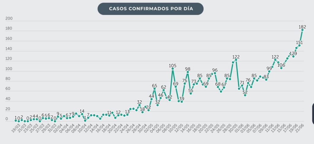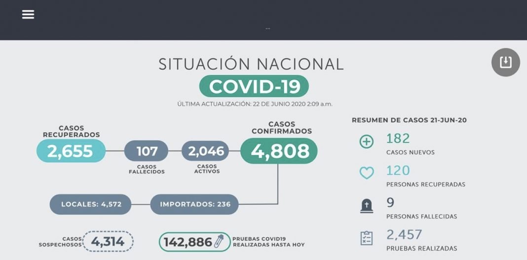 Por sexto día consecutivo, el país  cerró con un nuevo récord en la detección de casos de coronavirus: 182; por lo cual la estadística nacional se elevó a 4,808 contagios.
