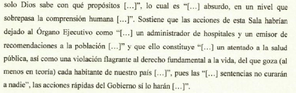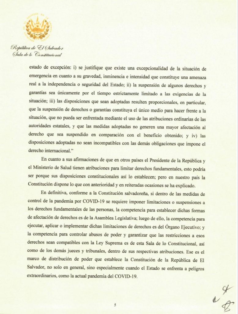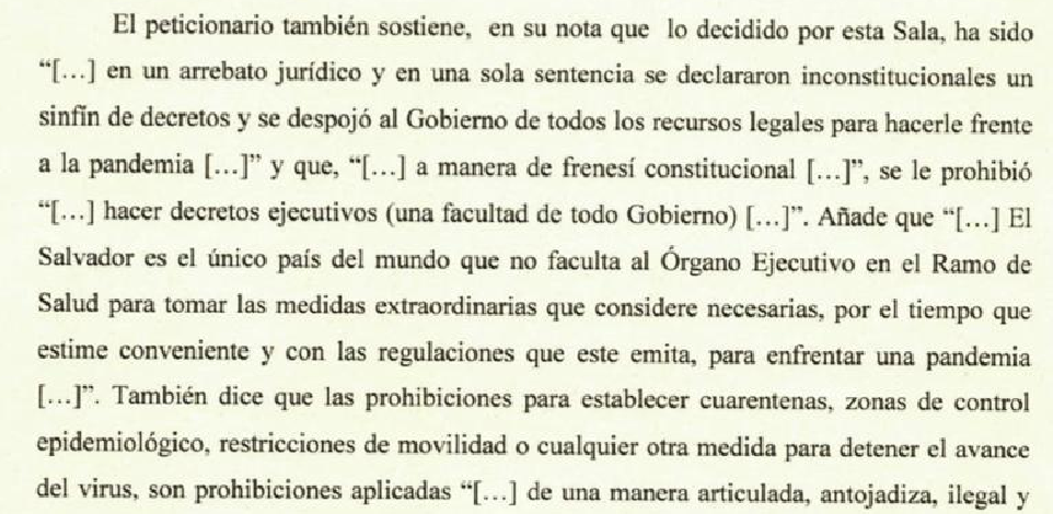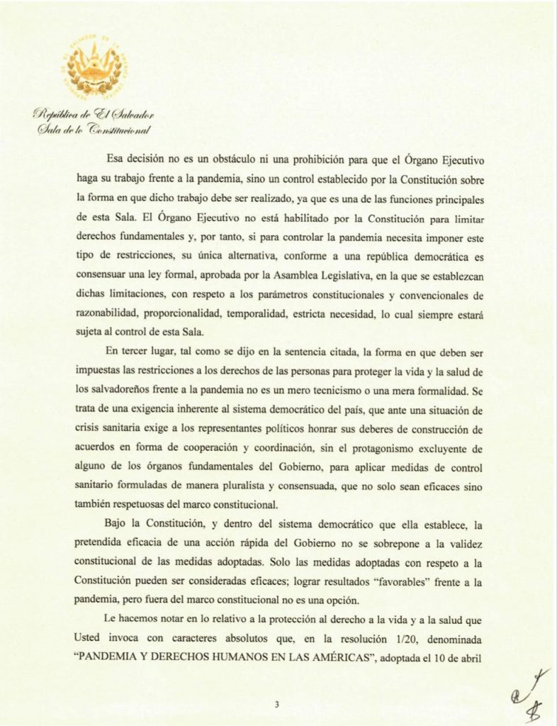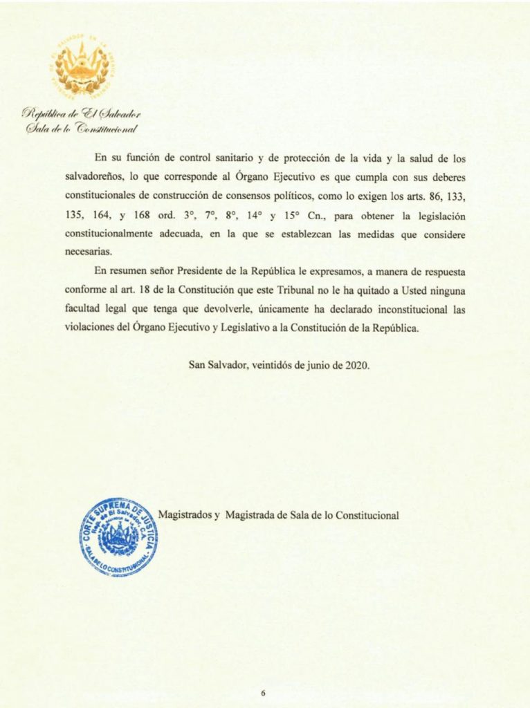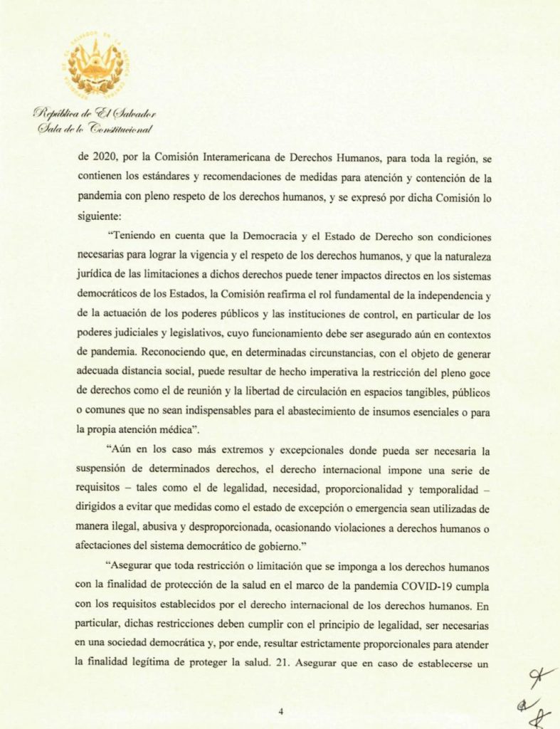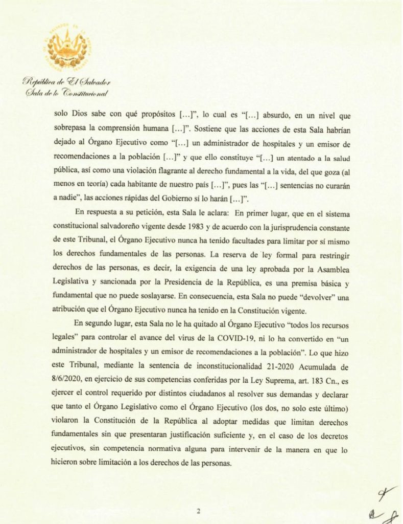 Y añaden: «Lo que hizo este tribunal, mediante sentencia de inconstitucionalidad 21-2020 Acumulada, es ejercer control requerido al resolver sus demandas y declarar que el Órgano Ejecutivo –y la Asamblea Legislativa– violaron la Constitución al adoptar medidas que limitan derechos fundamentales sin presentar justificación suficiente».