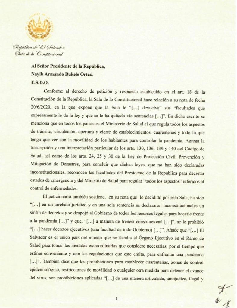 La Sala de lo Constitucional de la Corte Suprema de Justicia respondió al Presidente Nayib Bukele luego que éste último les solicitó devolver facultades legales para aplicar medidas para evitar la expansión del coronavirus en el país.
