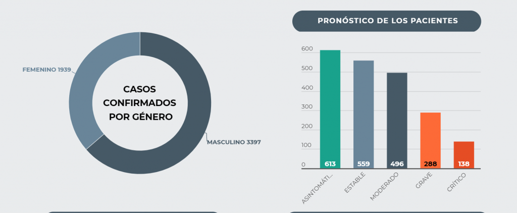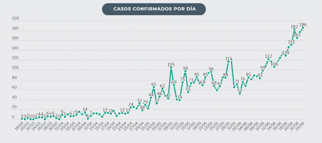Al 25 de junio, se reportan 5,336 casos confirmados de COVID-19. 2,094 se encuentran activos (613 asintomáticos, 559 estables, 596 moderados, 288 graves y 138 críticos); mientras que 3,116 se han recuperado exitosamente, y 126 han perdido la vida.