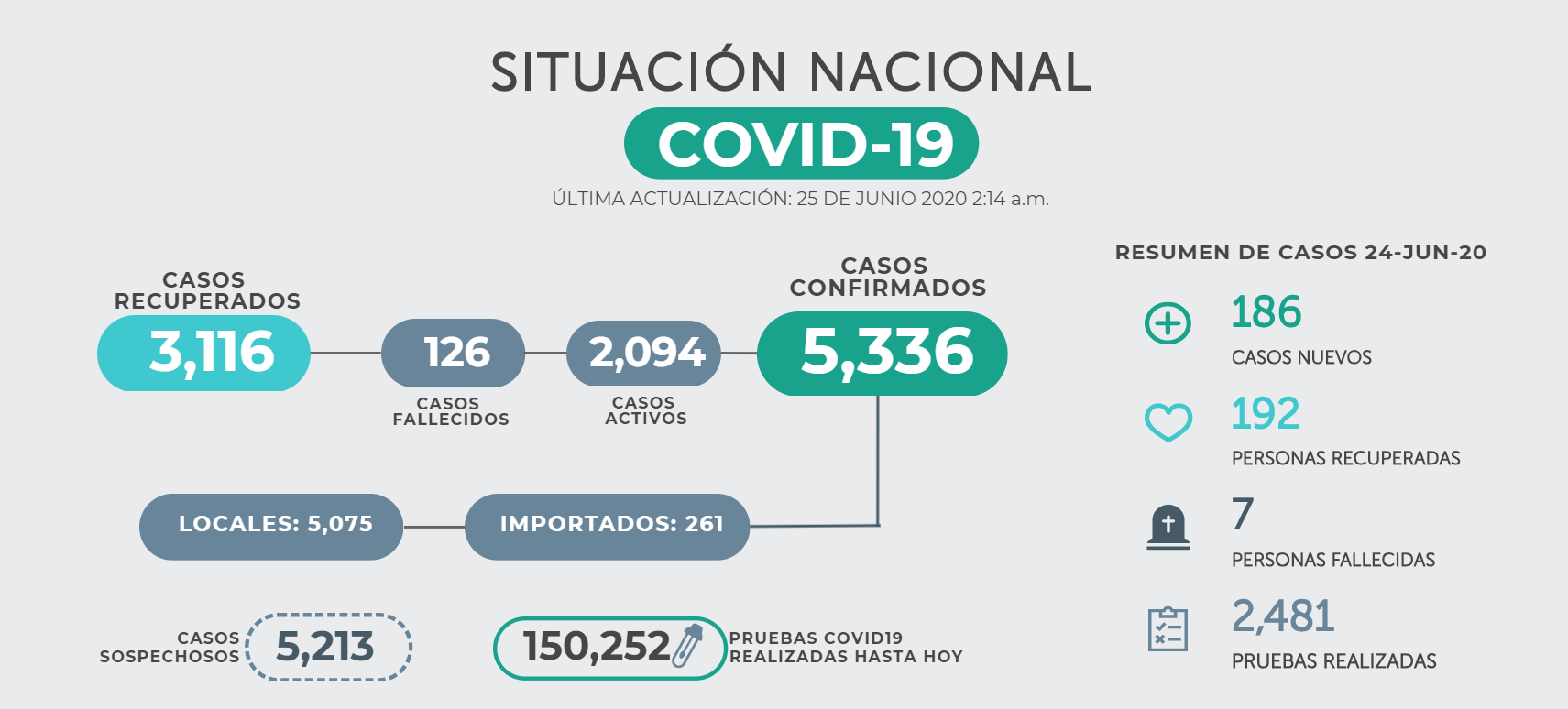 Al 25 de junio, se reportan 5,336 casos confirmados de COVID-19. 2,094 se encuentran activos (613 asintomáticos, 559 estables, 596 moderados, 288 graves y 138 críticos); mientras que 3,116 se han recuperado exitosamente, y 126 han perdido la vida.