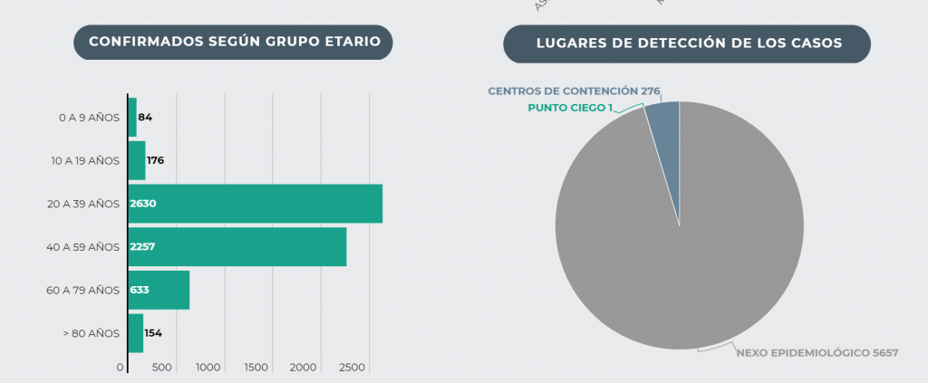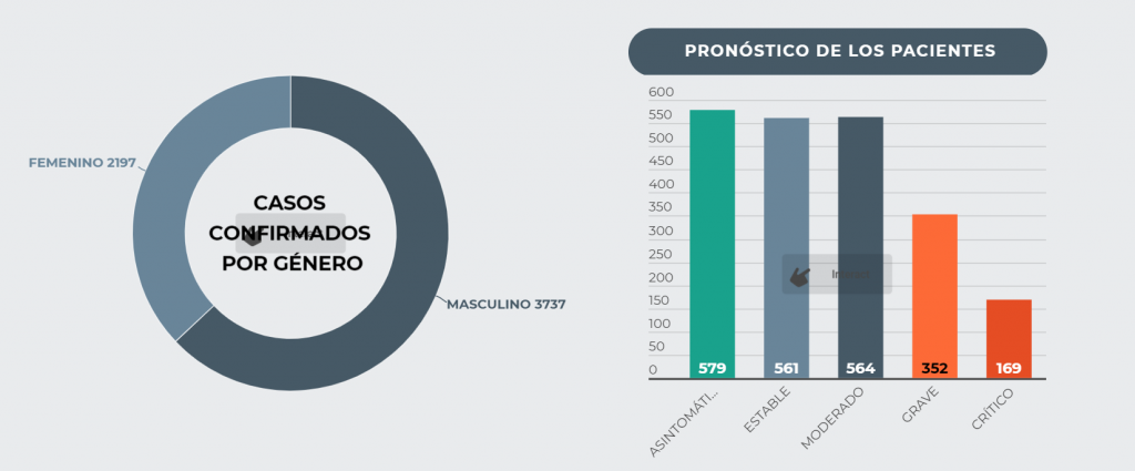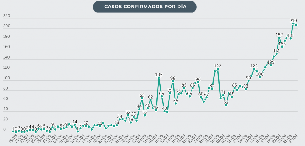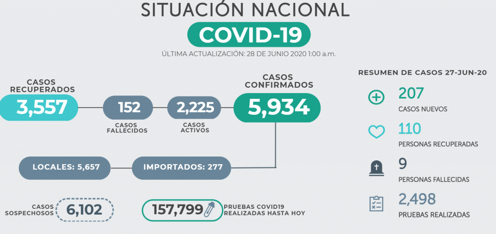 Al 28 de junio, se reportan 5,934 casos confirmados de COVID-19. 2,225 se encuentran activos (579 asintomáticos, 561 estables, 564 moderados, 352 graves y 169 críticos); mientras que 3,557 se han recuperado exitosamente, y 152 han perdido la vida.