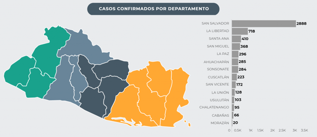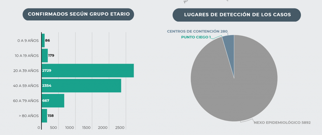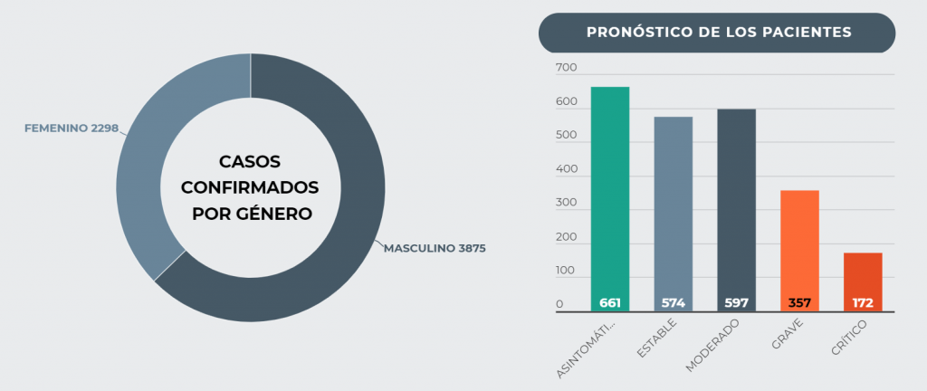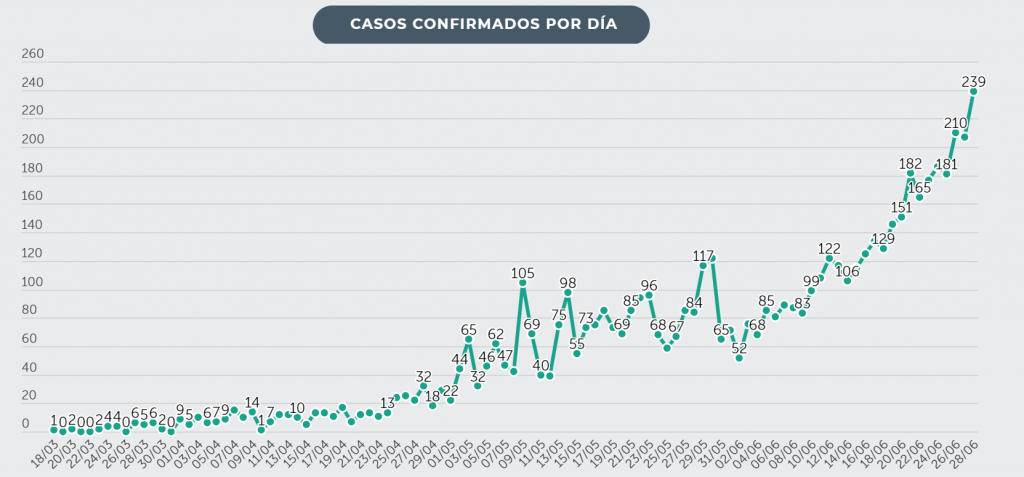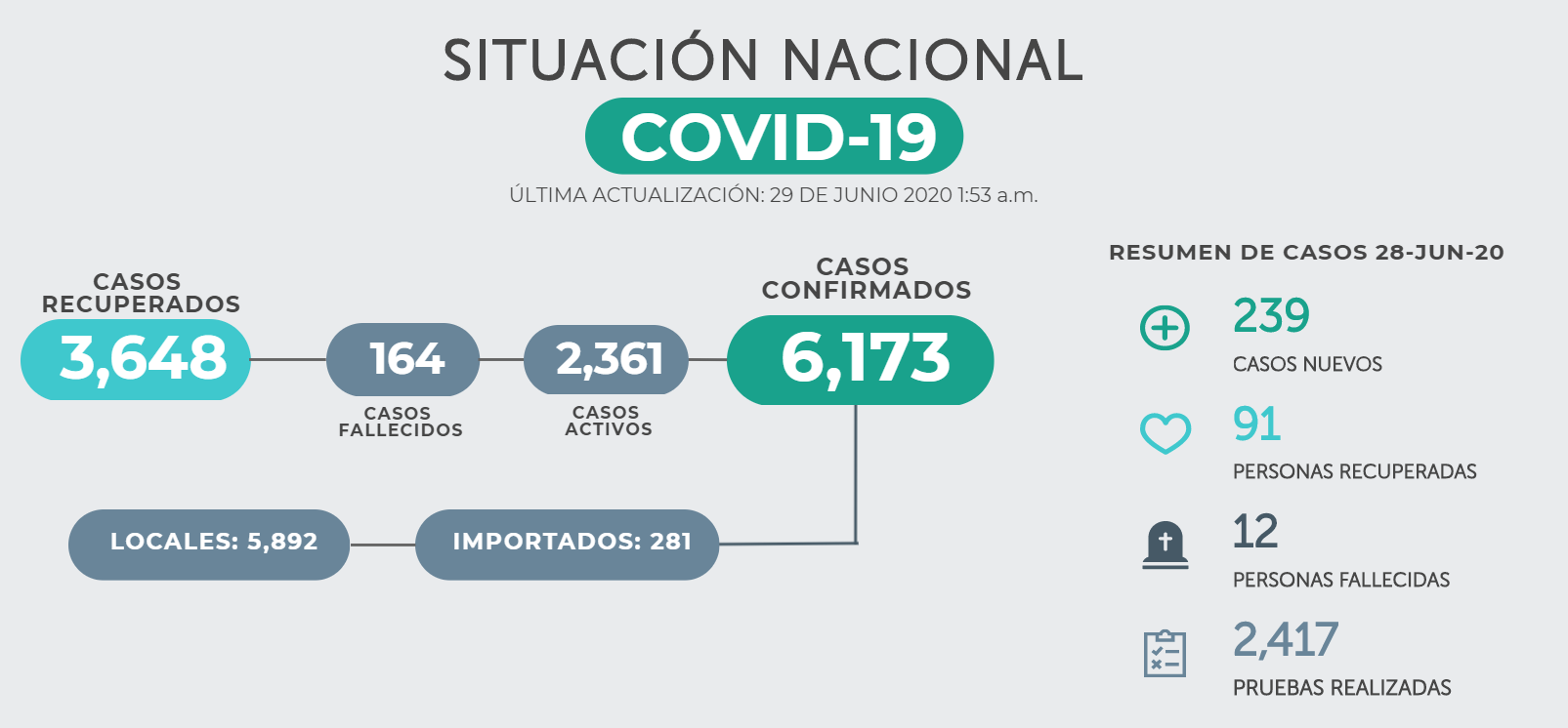 Al 29 de junio, se reportan 5,173 casos confirmados de COVID-19. 2,361 se encuentran activos (661 asintomáticos, 574 estables, 597 moderados, 357 graves y 172 críticos); mientras que 3,648 se han recuperado exitosamente, y 164 han perdido la vida.