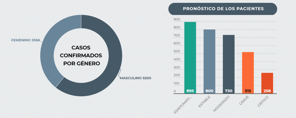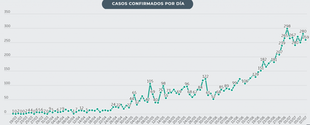 Al 8 de julio, se reportan 8,566 casos confirmados de COVID-19. 3,198 se encuentran activos (895 asintomáticos, 800 estables, 730 moderados, 515 graves y 258 críticos); mientras que 5,133 se han recuperado exitosamente, y 235 han perdido la vida.