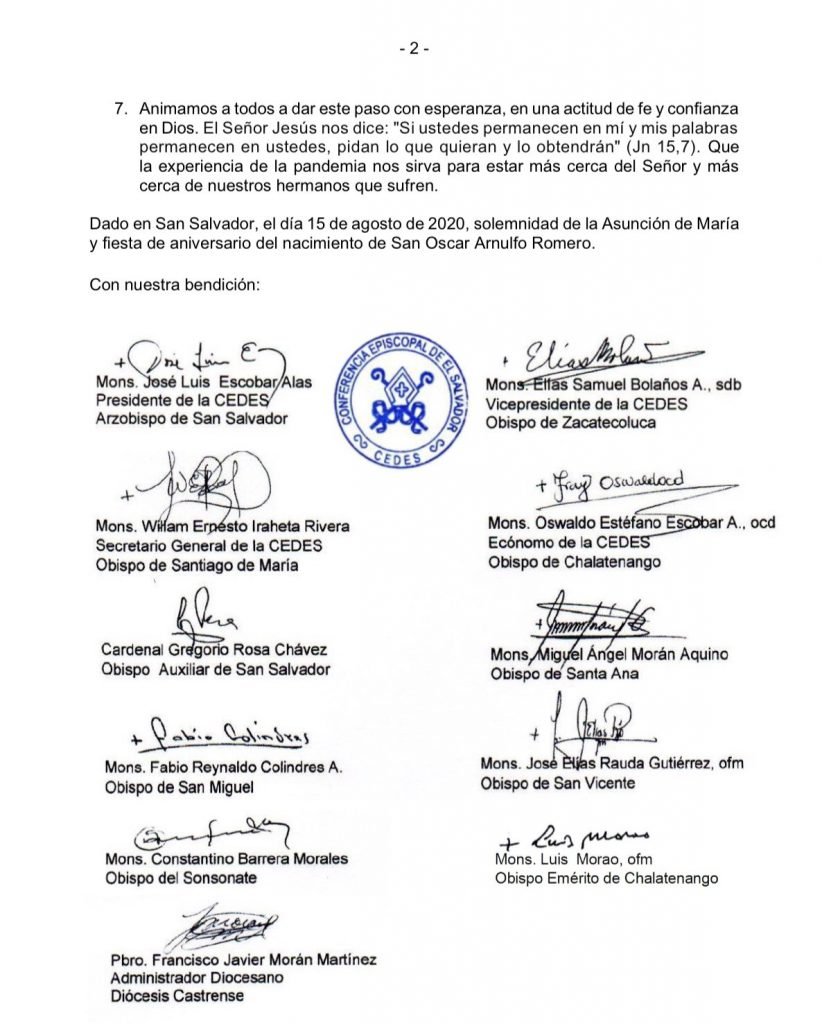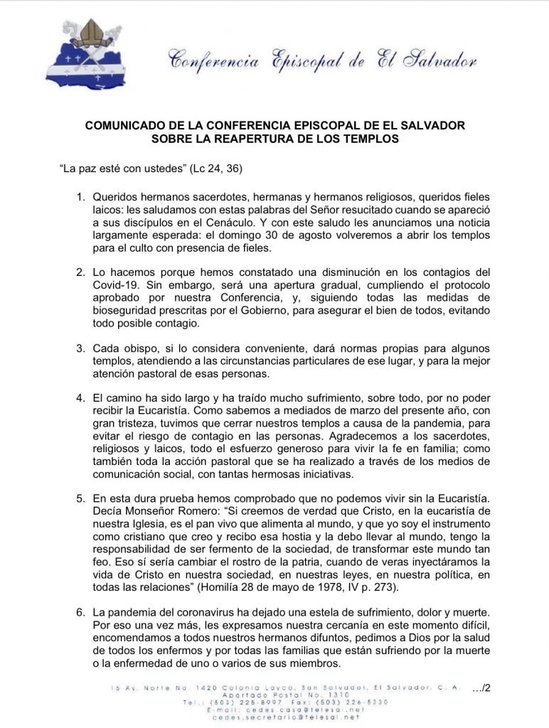 La Conferencia Episcopal de El Salvador anunció este domingo que la apertura de templos, iglesias y sedes eclesiásticas se hará con protocolos de bioseguridad el próximo 30 de agosto.