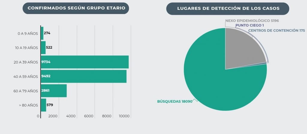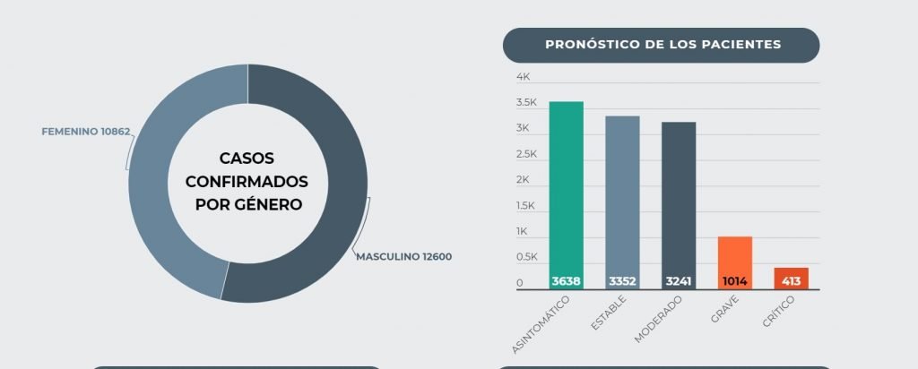 11,658 se encuentran activos (3,638 asintomáticos, 3,352 estables, 3,241 moderados, 1,014 graves y 413 críticos); mientras que 11,179 se han recuperado exitosamente, y 625 han perdido la vida.
