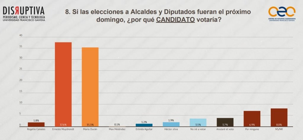 Al cuestionar sobre «si las elecciones a Alcaldes y Diputados fueran el próximo domingo, ¿por qué candidato votaría?». Muyshondt obtiene una corta ventaja, con 37.6% de los encuestados, seguido por Durán con 35.3%.
