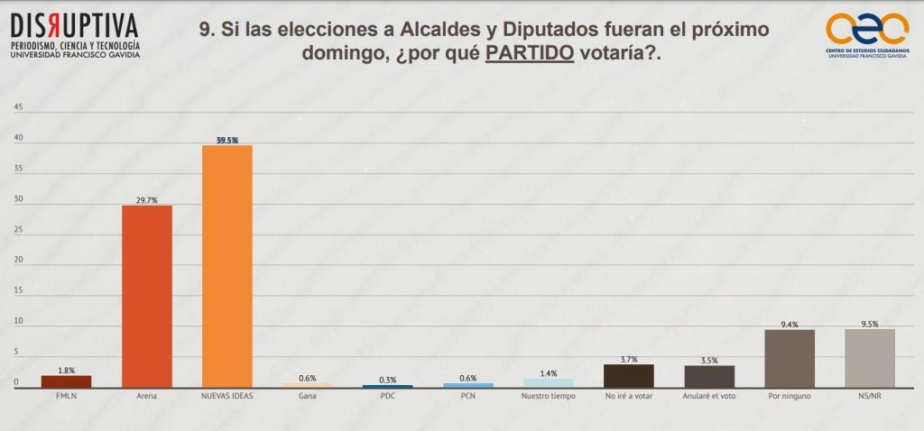 No obstante, al preguntar sobre «¿por qué partido votaría?», ARENA, del actual alcalde obtiene un 29.7% y Nuevas Ideas un 39.5%.