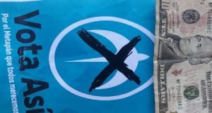 El aspirante por la comuna metapaneca sobrevoló el municipio el 24 de febrero, en el marco del cierre de campaña, y arrojó billetes de diferentes denominaciones, engrapados en volantes con su nombre y distintivos del partido de la golondrina, pidiendo el voto.
