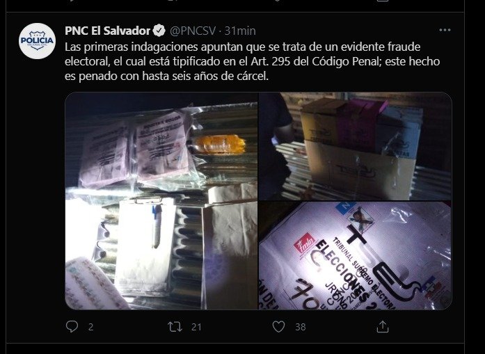 Según la PNC, el hallazgo del material electoral se trataría de un delito de fraude electoral, tipificado en el artículo 295 del Código Penal, estableciendo una pena de hasta seis años de cárcel.