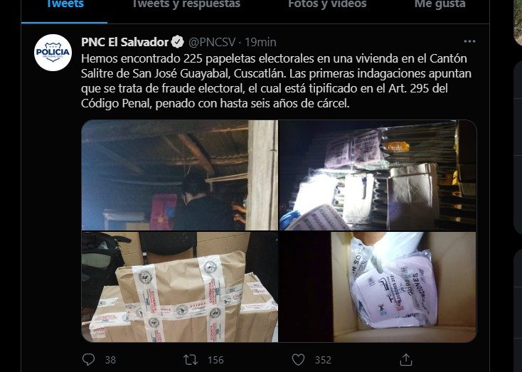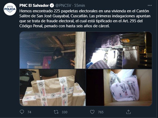 La Policía Nacional Civil (PNC) confirmó el hallazgo de papeletas de votación en una vivienda en el Cantón Salitre de San José Guayabal, Cuscatlán.