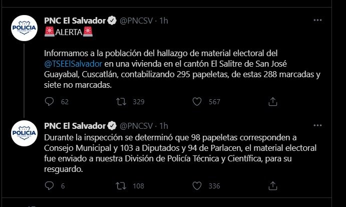 Hasta el cierre de esta nota, la Policía ha difundido tres tipos de información a través de su cuenta oficial de twitter; en la primera señaló que eran 295 las papeletas encontradas, luego se borraron los tweets y se colocó que son 225 papeletas.