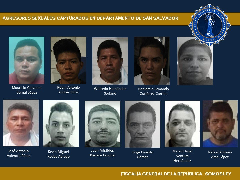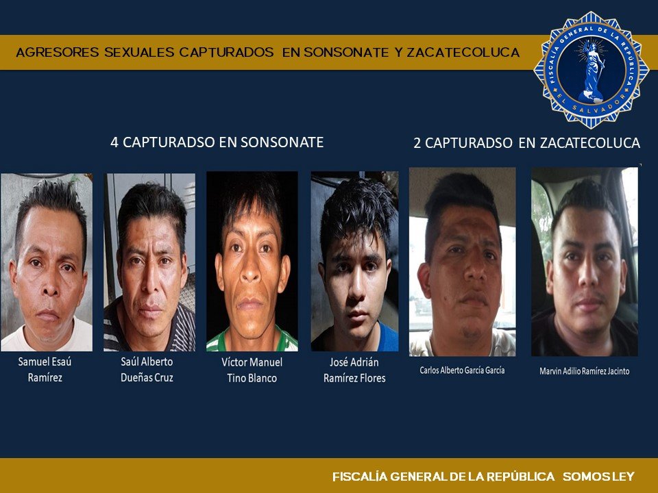 Por otra parte, en Sonsonate se giró orden captura contra José Adrián Ramírez Flores, Víctor Manuel Tino Blanco, Samuel Esaú Ramírez y Saúl Alberto Dueñas Cruz, por diversos delitos de Violación en Menor o Incapaz Agravada y Otras Agresiones Sexuales, en perjuicio de diferentes víctimas.