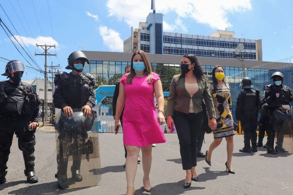 Las Diputadas del FMLN, Dina Argueta y Anabel Belloso salieron para recibir solicitud de los manifestantes. Foto: Cortesía.