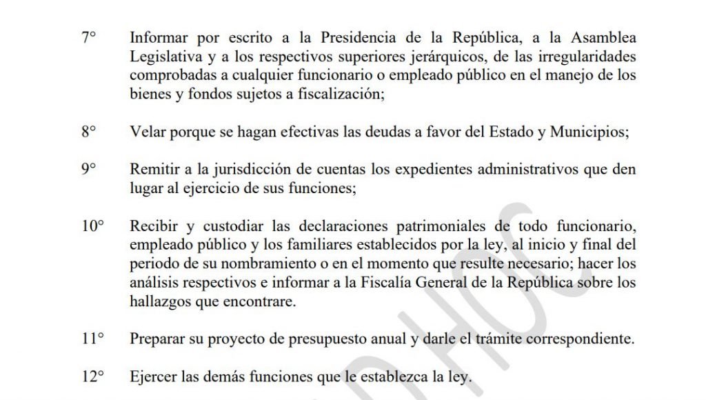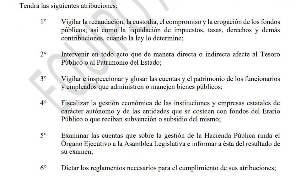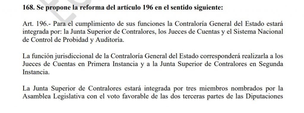 La Controlaría General de Estado, sustituirá a la Corte de Cuentas de la República, y se encargará de los exámenes de “legalidad y corrección del ingreso y gasto público”, además fiscalizará la ejecución presupuestaria y todo lo relacionado con las entidades que administren fondos públicos.