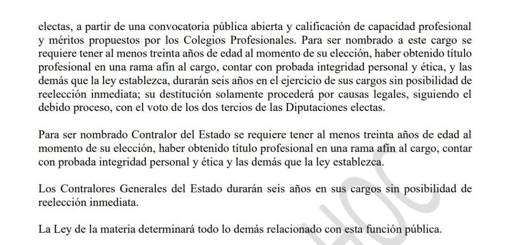 El borrador comprende un capítulo completo para detallar su composición y sus atribuciones. Según el artículo 195, la Contraloría estará conformada por: Contraloría General de Estado, Procuraduría para la Defensa de los Derechos Humanos, el Tribunal de Ética Gubernamental, el Instituto de Acceso a la Información Pública y la Defensoría del Consumidor.