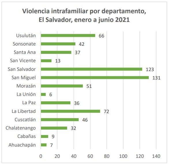 Según los datos del Observatorio de Seguridad Ciudadana de las Mujeres, cuatro departamentos reportaron el 72% de las denuncias, estos son San Miguel, San Salvador, La Libertad y Usulután. Es importante señalar que debido a la cantidad de población residente en la capital salvadoreña, San Salvador siempre aparece con la mayor cantidad de casos, no obstante, en el periodo analizado, San Miguel ocupa el primer lugar con 131 casos.