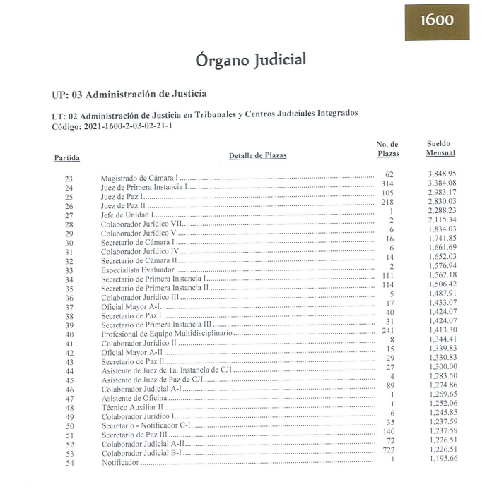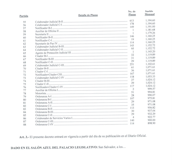 “Implica el otorgamiento de una indemnización a Magistrados y Jueces de 24 sueldos, como un reconocimiento al destacado desempeño en la administración de justicia; así mismo, una nueva estructura de clases y categorías de dichos funcionarios, conlleva una nivelación salarial”, dicta el decreto aprobado, que pidió el Ministerio de Hacienda.