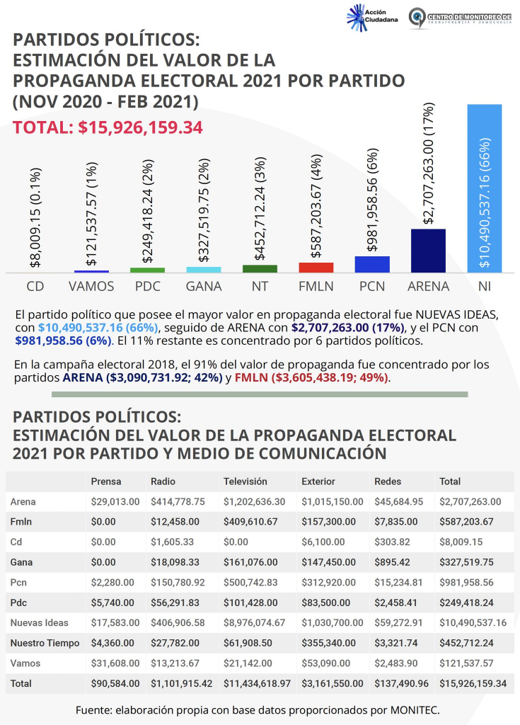 Nuevas Ideas concentró más de la mitad del valor total de propaganda electoral, con $10 millones 490 mil 537 dólares (66%); le sigue ARENA con $2 millones 707 mil 263 dólares (17%); y el PCN con $981,958 (6%). El 11% de la pauta se concentró entre los otros seis partidos políticos.