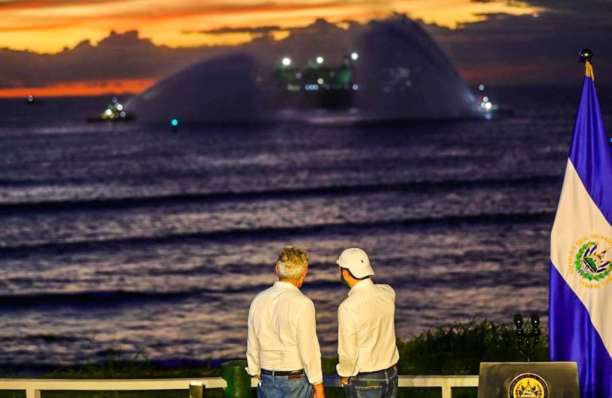 La llegada del primer buque carguero de gas contó con la asistencia del Presidente Nayib Bukele y Michael Polsky, CEO de Invenergy, propietaria de Energía del Pacífico.
