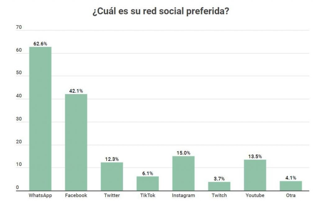 Durante la encuesta, se le preguntó a la población “¿Cuál es su red social preferida?” Entre las primeras tres opciones con mayor resultado, el 62.6% respondió que “WhatsApp”; un 42.1% señaló “Facebook” y el 15.0% “Instagram”.