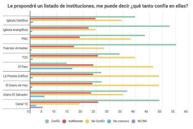 Un 55% aseguró “confiar” en las “Fuerzas Armadas”; un 53% indicó que confía en “Iglesia Evangélica” y un 48% dijo que confía en el estatal “Canal 10”.