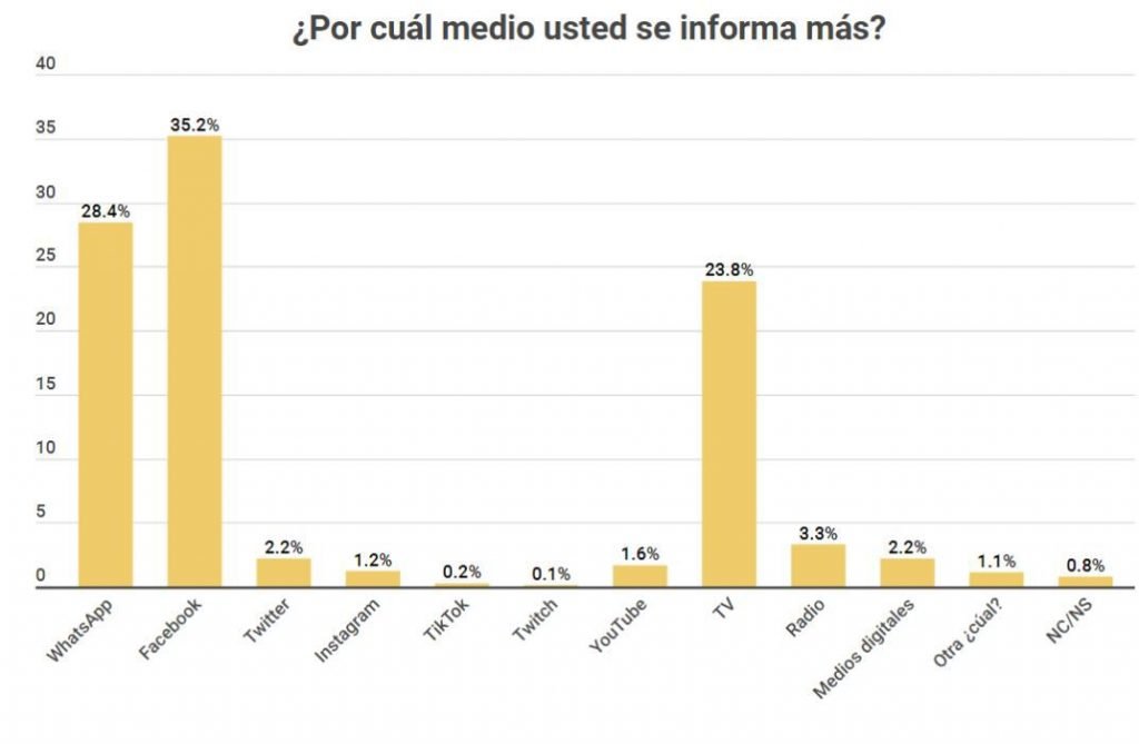 Entre otros temas evaluados, la exploración refleja que el 35.2% de la población utiliza “Facebook” como medio para informarse; en segundo lugar está “WhatsApp” con el 28.4%, por último se encuentra “TV” que sumó 23.8%.