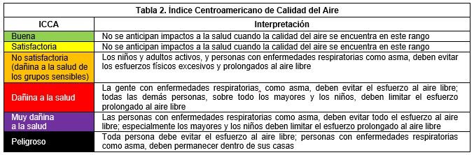 La calidad del aire que se respira en el AMSS, se clasifica según los valores establecidos por el Índice Centroamericano de Calidad del Aire (ICCA), los cuales se especifican en la Tabla 2.