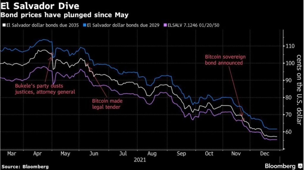 El presidente de El Salvador, Nayib Bukele, se convirtió en un héroe para los fieles del bitcoin este año al adoptar incondicionalmente a la criptomoneda. Los inversores en bonos tienen una opinión totalmente diferente sobre el líder del país.