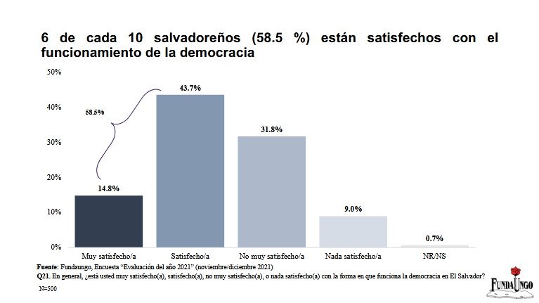 Un total de 58.5% de los encuestados respondieron sentirse “satisfechos” con la forma en que funciona a la democracia en El Salvador; mientras que el 31.8% señaló estar “no muy satisfechos”.