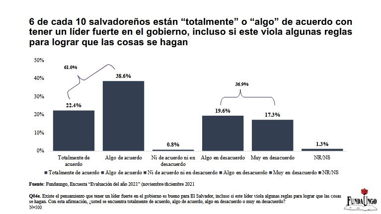 En otra de las interrogantes, se le preguntaba a la población si estaban de acuerdo con el hecho de tener un líder fuerte en el gobierno es bueno para El Salvador, incluso si este líder viola algunas reglas para lograr que las cosas se hagan.