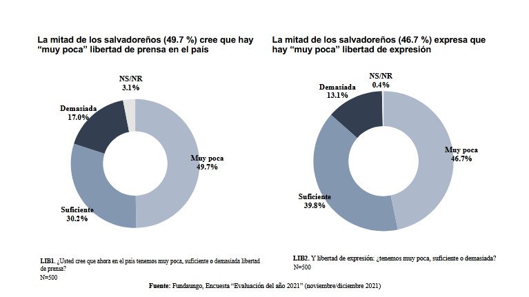 En este apartado, la mitad de los salvadoreños (49.7%) cree que hay “muy poca” libertad de prensa en el país. Y el 46.7% expresa que hay “muy poca” libertad de expresión.