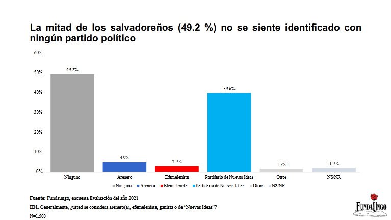 En cuanto a la afinidad partidaria de la población, el porcentaje más alto fue del 49.2% quienes indicaron no sentirse identificados con ningún partido político; el 36.6% dijo que se identifica con Nuevas Ideas; un 4.9%, con el partido ARENA, y el 2.9% FMLN.