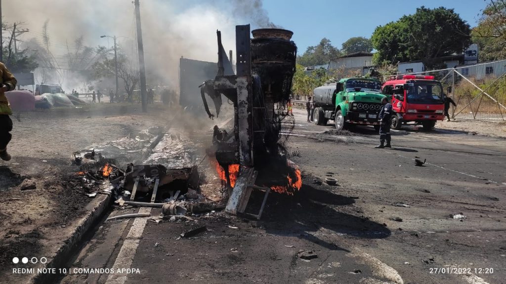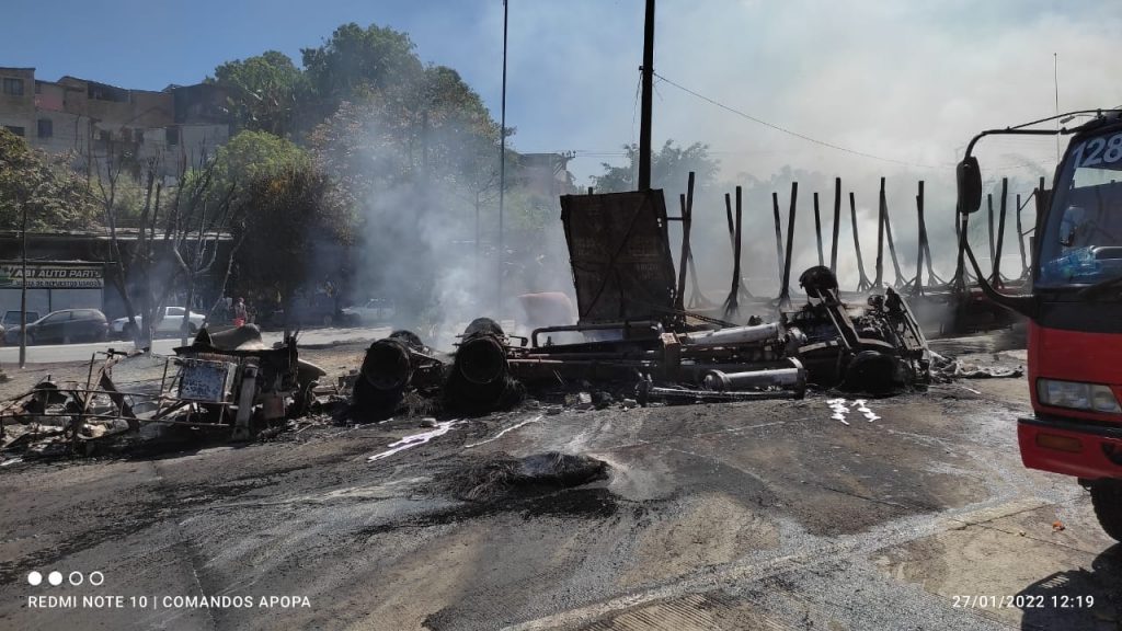Un incendio en un camión cisterna que transportaba combustible se registró en horas de la mañana de este jueves sobre el kilómetro 4 y medio de la carretera Troncal del Norte.