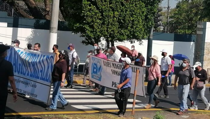 En horas de la mañana de este viernes, maestros de Bases Magisteriales, Sindicato de Maestras y Maestros de la Educación Pública de El Salvador (SIMEDUCO) y Andes 21 de junio, se concentraron en el Monumento al Divino Salvador del Mundo, para marchar a Casa Presidencial (CAPRES) y exigir reforma de pensiones y dejar sin efecto decreto que regula contratación de docentes interinos.