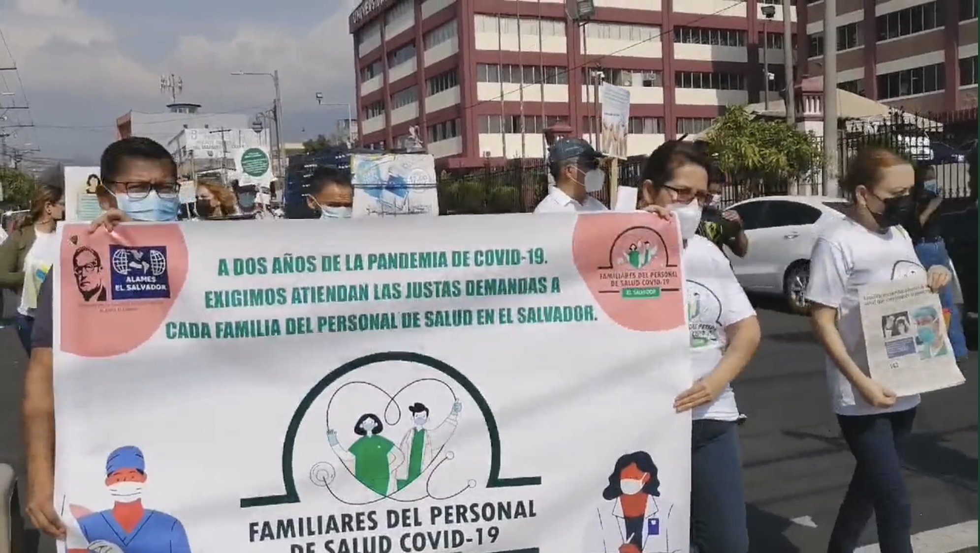 Familiares de médicos y enfermeras que fallecieron a causa del COVID-19 mientras daban su servicio marcharon hasta el Ministerio de Salud para exigir la indemnización que siguen sin recibir, a pesar de ser decretada por la Asamblea Legislativa en septiembre de 2020.