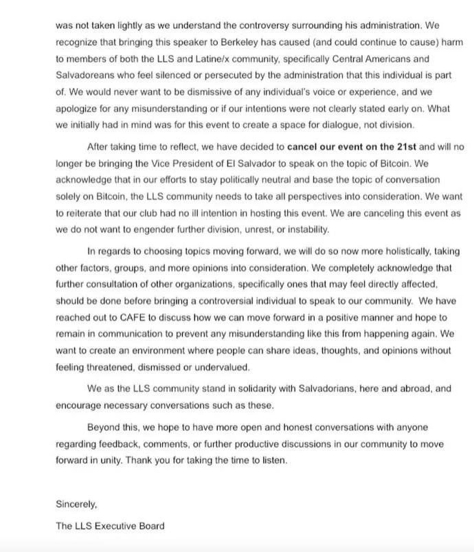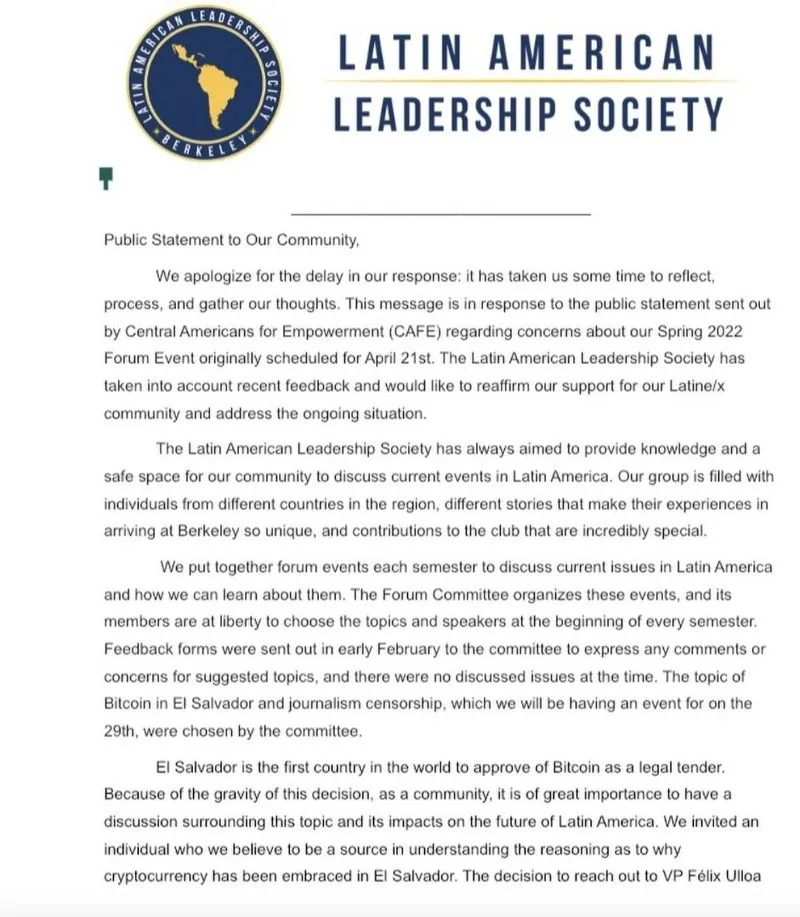 “Invitamos a un individuo que creemos que puede ser una fuente de entendimiento en el razonamiento del por qué esta divisa ha sido adoptada en El Salvador. La decisión de acercarnos al Vicepresidente del Salvador, Félix Ulloa, no fue tomada a la ligera y nosotros comprendemos la complejidad y la controversia alrededor de su administración”, expresó textualmente el pronunciamiento.