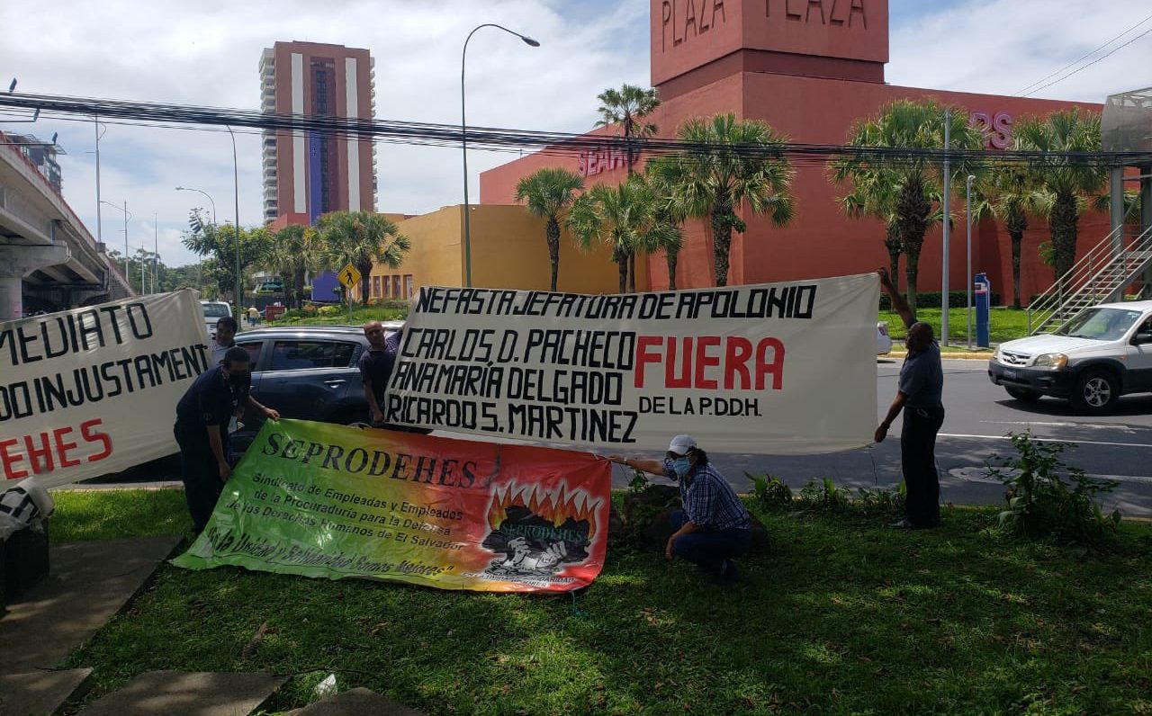El Sindicato de Empleadas y Empleados de la Procuraduría para la Defensa de los Derechos Humanos de El Salvador (Seprodehes), marchó este jueves para poner en manifiesto su inconformidad ante presuntas violaciones de derechos humanos por parte del procurador José Apolonio Tobar y su equipo de trabajo, el procurador ajdunto, Ricardo Salvador Martínez; Dagoberto Pacheco, secretario general de la PDDH y Ana María Delgado Orellana, secretaria técnica del Despacho.