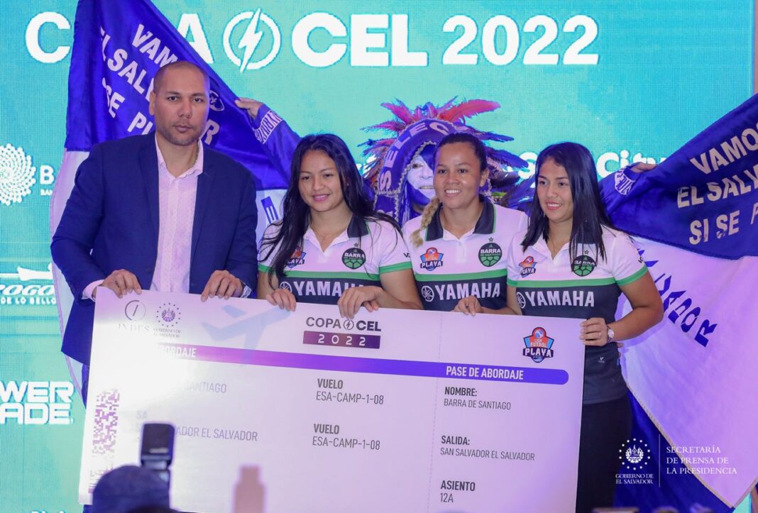 Asimismo, Bukele entregó de manera simbólica los boletos aéreos a los equipos femenino y masculino Barra de Santiago, campeones de la Copa CEL 2022, para que asistan a la próxima edición de la World Winners Cup.