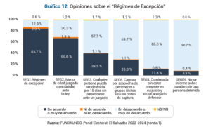Un 83.7 % de los salvadoreños avalan el régimen de excepción como estrategia para la desarticulación de bandas criminales en el país, según los resultados de la encuesta de opinión ciudadana realizada por el Centro de Estudios de Opinión Pública de la Fundación Dr. Guillermo Manuel Ungo (Fundaungo).