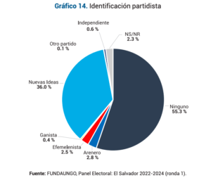 Un estudio reveló que alrededor del 55.3 % de los ciudadanos no se identifica con ningún partido político. Estos resultados fueron revelados en el informe sobre la «Evaluación de la gestión gubernamental y temas de actualidad 2022» realizado por el Centro de Estudios de Opinión Pública de la Fundación Dr. Guillermo Manuel Ungo (Fundaungo).