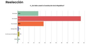 La encuesta reveló que el 56.4 % de la población afirma que no ha leído la Constitución de la República, un 23.1 % si la ha leído poco y 18.3 % si la ha leído y un 1.3 % no sabe que es la Constitución.