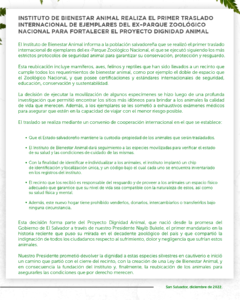 Bienestar Animal indicó a través de un comunicado, que se realizó un convenio de cooperación internacional que establece que los especímenes que fueron trasladados se mantiene bajo la custodia y propiedad del Estado salvadoreño, agregando que el lugar de destino tiene prohibida la venta, donación, intercambio o transferencia de los animales bajo ninguna circunstancia, así como que los recintos tienen que brindar un espacio físico adecuado que garantice la integridad.