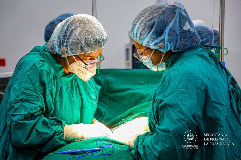 El personal médico, compuesto por 35 especialistas del Hospital Nacional de Niños “Benjamín Bloom”, una jornada de cirugías pediátricas, este sábado, bajo la coordinación del Ministerio de Salud (MINSAL).