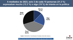 Inicialmente, se consultó sobre el interés en la política, por parte de los encuestados, dando a conocer que un 12.3% expresaba mucho, un 19.0% algo, un 39.0% poco, y un 29.7% nada de interés.