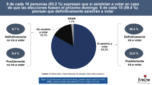 Además, un 83.2% de los participantes dice que estaría dispuesto a a votar en caso de que las elecciones fuesen el próximo domingo; mientras que 15.1% declara que no asistiría a votar; por su parte, el 1.7 % no sabe o no responde.