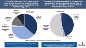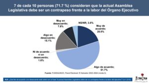 Además, la evaluación indica que el 71.7% de los consultados, lo que equivale a 7 de cada 10 personas, consideran que la actual Asamblea “debe ser un contrapeso frente a la labor del Órgano Ejecutivo”, detalla el documento.