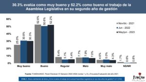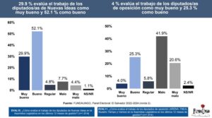 “Al evaluar la labor de los diputados y diputadas de Nuevas ideas, el 29.9 % lo considera un trabajo muy bueno, el 52.1 % bueno, 4.8 % lo cataloga como regular, el 7.7 % lo evalúa como malo, el 4.4 % muy malo y 1.1 % no sabe o no contesta la pregunta (…) A su vez, sobre el trabajo de los diputados y diputadas de oposición (ARENA, FMLN, Nuestro Tiempo y Vamos), el 4 % lo cataloga como muy bueno, el 25.3 % lo evalúa como bueno, 5.8 % regular, el 41.9 % considera que es un mal trabajo y 20.6 % como muy malo. El 2.4 % no sabe o no contesta”, cita el informe.