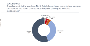 En cuanto al cuestionamiento de si Bukele busca hacer con su trabajo lo que es bueno para todos los salvadoreños, un 56% de los entrevistados afirma que “siempre”, y un 35% “casi siempre”; por otro lado, un 4% estima que casi nunca, y un 3% dice que “nunca”.